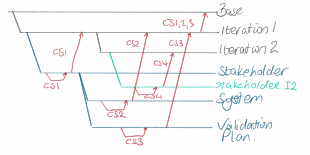 Once the highest level requirements document is issued for the iteration, a sub-stream for each dependent document can be created – these are also created from the Iteration stream, following a baseline. Now work can continue in these streams, the final two lines in the diagram (System and Validation Plan), again in change sets. Change sets CS2 and CS3 are created for this purpose, and when complete, are delivered to the Iteration 1 stream.