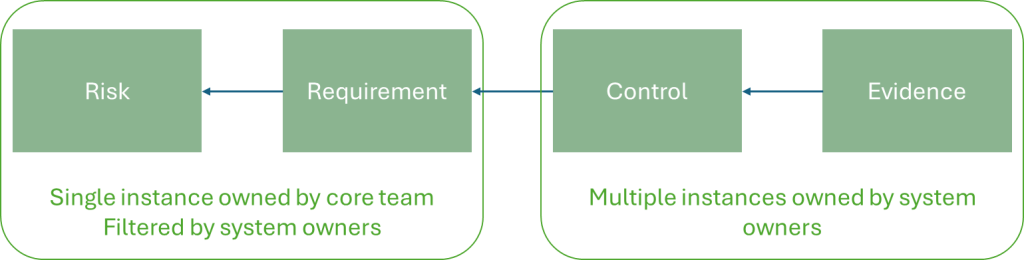 In this instance we have a standardised set of Risks and Requirements which are applicable to one or more systems. All of the Risks and Requirements are captured here, but not all are applicable to every system. The links are base-to-base.